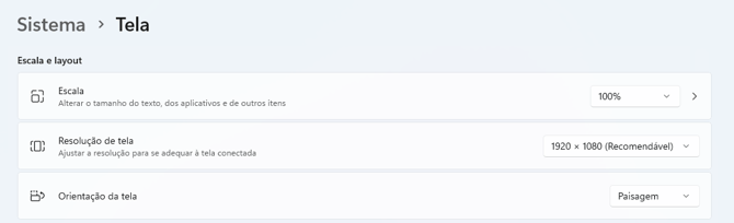 - Nas configurações de tela, ajuste o item "Escala - Alterar o tamanho do texto, dos aplicativos e de outros itens" para 100%, ou no máximo 125%.
