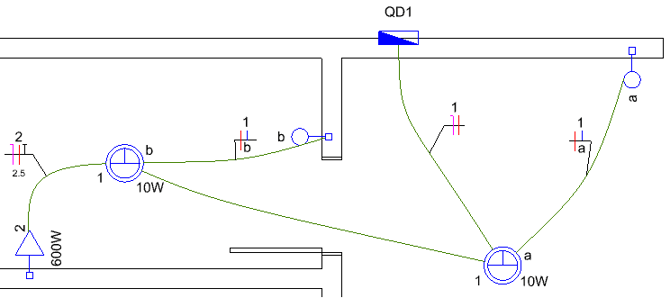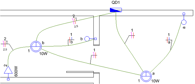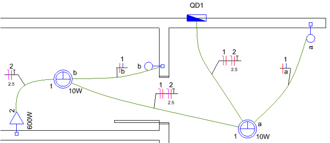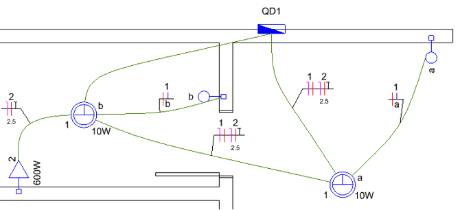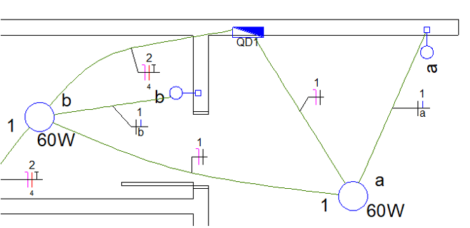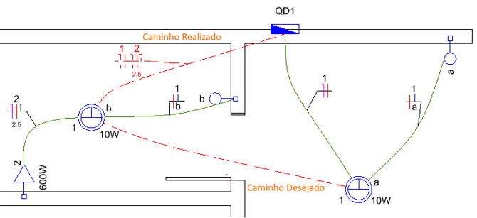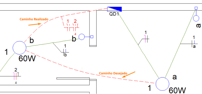 Como podemos ver na imagem acima, existem dois caminhos de condutos possíveis saindo do QD e chegando na lâmpada associada ao comando "b".