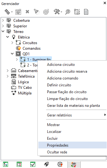 Na janela Gerenciador selecionar o circuito que está com o caminho da fiação desejado, clicar com o botão direito do mouse e selecionar Propriedades;