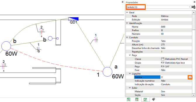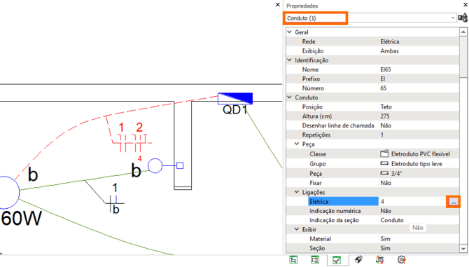 2 - Incluindo a fiação acessando o diálogo Ligações através das propriedades do conduto