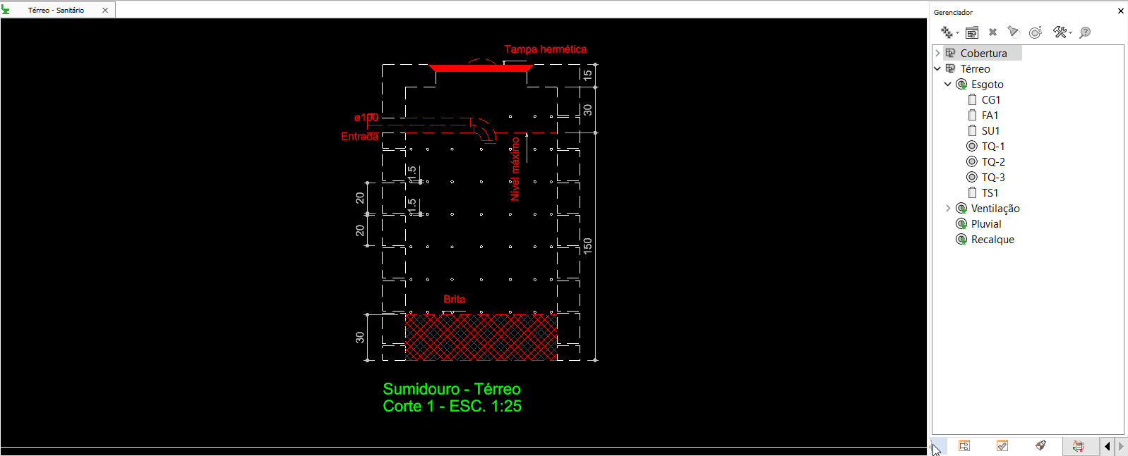 O AltoQi Builder gera automaticamente os detalhes das unidades de tratamento, incluindo suas plantas baixas e cortes, a partir dos elementos inseridos no projeto. Assim, ao lançar no croqui sanitário unidades como tanque séptico (fossa), filtro anaeróbio, sumidouro, caixa de gordura, vala de filtração e vala de infiltração, o programa apresenta esses elementos no gerenciador, permitindo a inclusão e visualização dos respectivos detalhes na planta. Ainda, é possível editar os detalhes gerados, ajustando e personalizando a representação das unidades conforme as necessidades do projeto.