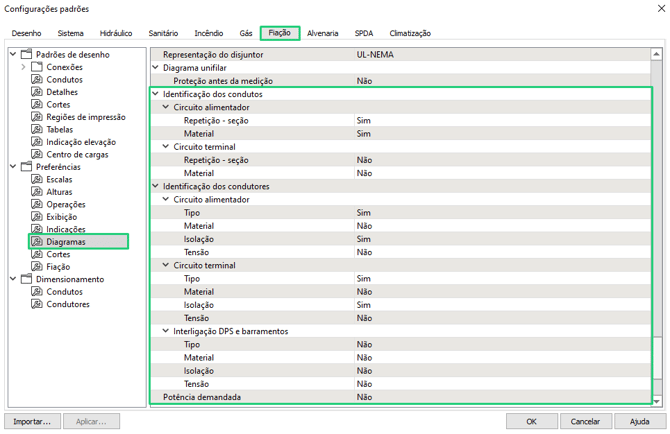 - Em Preferências - Diagramas, role a página na direita até que as opções Identificação dos condutos e Identificação dos condutores sejam exibidas, conforme mostrado na imagem abaixo: