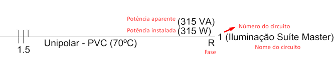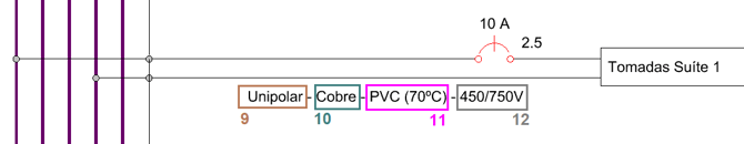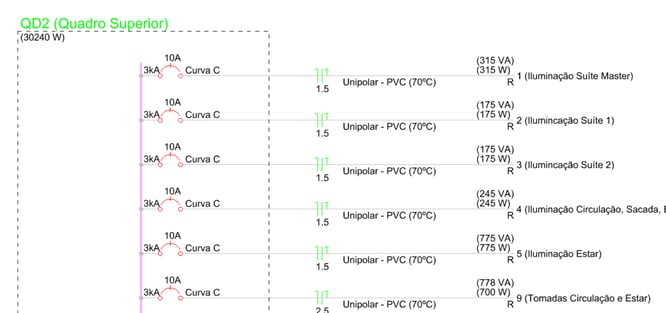 - Dados do quadro: na parte superior do barramento, é indicada a proteção do circuito do quadro e a fiação adotada, bem como a presença de dispositivos IDR ou DPS, se tiverem sido definidos na janela de propriedades do quadro. Também é indicada a seção do conduto, tipo e repetições. À parte, é gerada uma tabela indicando a potência total instalada e potência total demandada no quadro, em cada fase.
