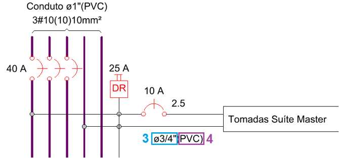 - Aterramento: sempre que o quadro possuir algum circuito com fiação de aterramento, considera-se que o quadro também está aterrado. Neste caso, é feita a representação do aterramento partindo de cada circuito aterrado até a entrada do quadro (suposta aterrada na origem).