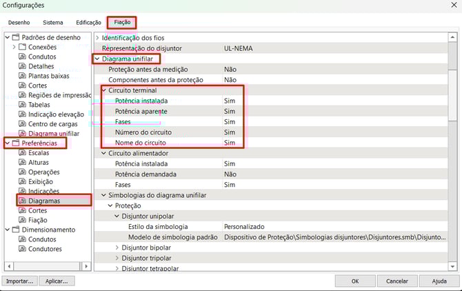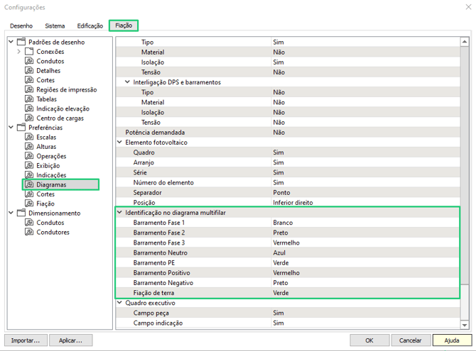 - Em Preferências - Diagramas, role a página na direita até que as opções Identificação no diagrama multifilar sejam exibidas, conforme mostrado na imagem abaixo: