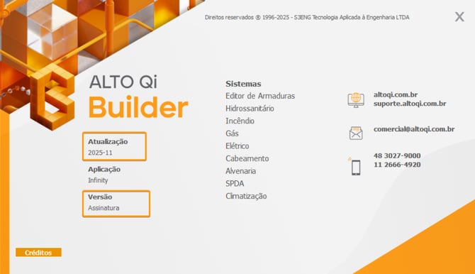 na barra de acesso rápido do AltoQi Builder; - Selecione a opção Sobre, que será redirecionado para a página com as informações do programa;