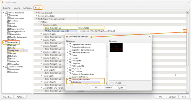 Após salvar a simbologia personalizada na biblioteca de símbolos, para realizar a personalização da simbologia , basta acessar o Menu Arquivo - Configurações e selecionar a opção de "personalizado":