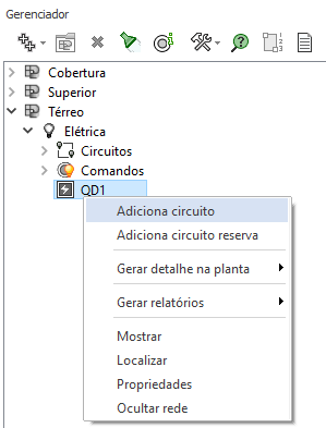 - Na janela Gerenciador selecione o QD, clique com o botão direito do mouse e selecione Adiciona circuito;