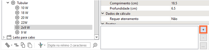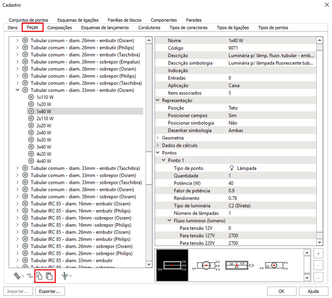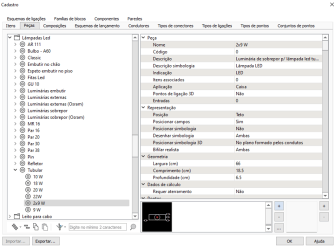 A seguir será apresentado o procedimento de cadastro de uma luminária de sobrepor para 2 lâmpadas tubulares LED (neste exemplo usaremos uma lâmpada de 9 W) que não encontra-se disponível no cadastro de peças do programa.