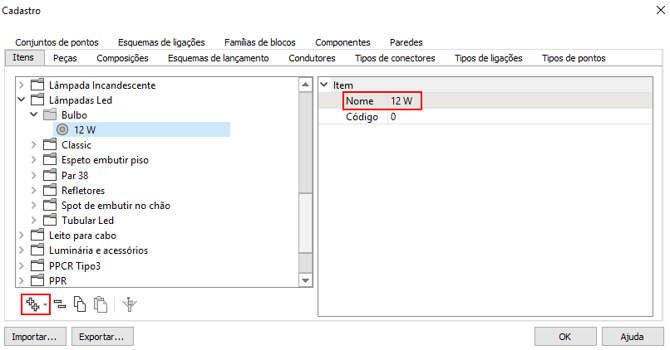 - Selecione esse item e altere seu Nome, por exemplo 12 W (este nome será exibido na lista de materiais):