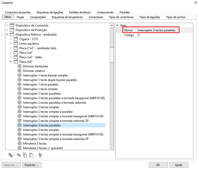 - Selecione esse item e altere seu Nome, por exemplo Interruptor 3 teclas paralelas (este nome será exibido na lista de materiais);