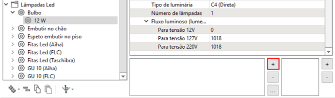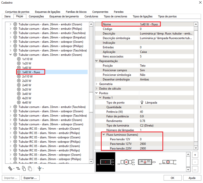 O cadastro de peças do AltoQi Elétrico possui a informação do Fluxo luminoso para cada lâmpada cadastrada. Neste caso é necessário criar uma nova peça para que um novo valor seja informado.