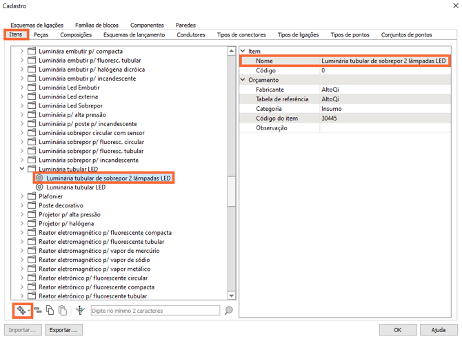- Selecione esse item e altere seu Nome, por exemplo Luminária tubular de sobrepor 2 lâmpadas LED (este nome será exibido na lista de materiais):