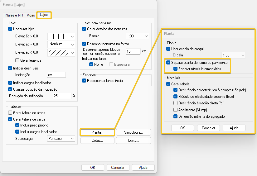 Atualmente, apenas o detalhamento das lajes das plantas de forma dos níveis intermediários pode ser gerado separadamente. A configuração está disponível na guia Estrutura > grupo Desenho > Formas > Lajes > Planta> Separar planta de forma do pavimento > Separar níveis intermediário: