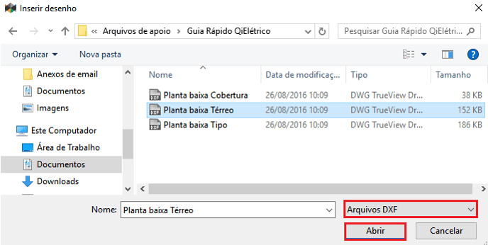 - No diálogo Inserir desenho, em Arquivos do Tipo selecione a extensão do arquivo que será importado;