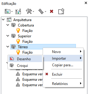 - Na janela Edificação selecione o pavimento desejado, clique com o botão direito do mouse e selecione o menu Importar – Desenho;