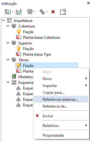 - Na janela Edificação clique com o botão direito do mouse sobre o projeto aberto e selecione a opção Referências externas...;