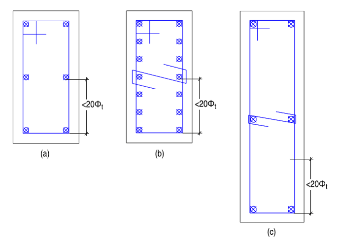 - Figura (b): perceba que neste caso, todas as barras encontram-se a uma distância menor do que 20Φt do canto do estribo poligonal. Todavia, perceba que nesta distância há mais de duas barras, sendo que a terceira barra na seção deverá ser travada por um estribo suplementar.