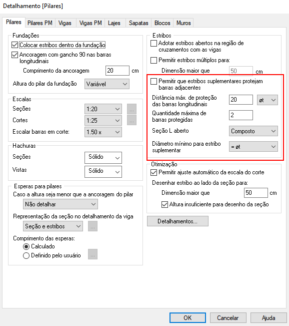 Estas disposições poderão ser configuradas pelo usuário no AltoQi Eberick acessando o menu Configurações – Detalhamento – Pilares, como mostrado abaixo. Nesta janela, será possível alterar a distância de travamento e também o número de barras que poderão ser travadas nesta distância. Além disso, também é possível determinar a bitola do estribo suplementar (como uma bitola fixa, ou igual à do estribo) e se o travamento das barras adjacentes aos estribos suplementares poderá ser considerada.