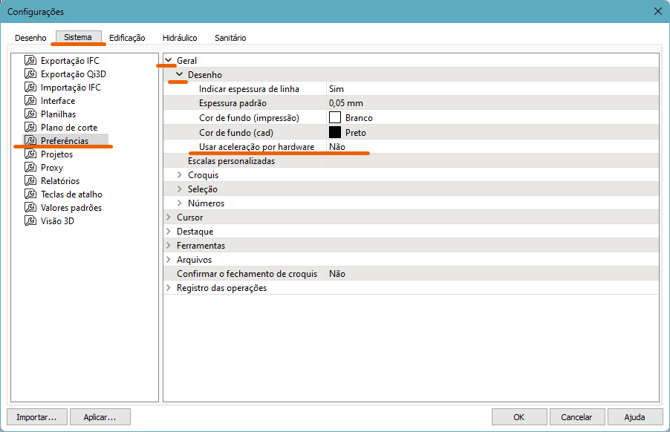 - Usar aceleração por hardware: Quando a opção for Sim, o programa utilizará de recursos gráficos da placa de vídeo para melhorar o desempenho e a manipulação de desenhos 2D.