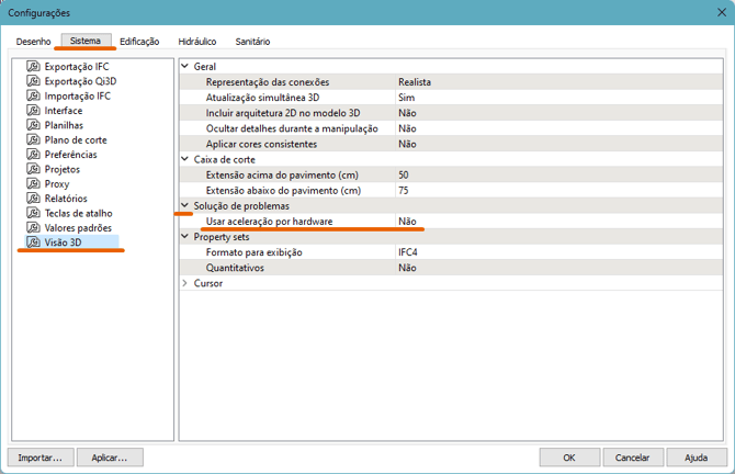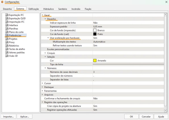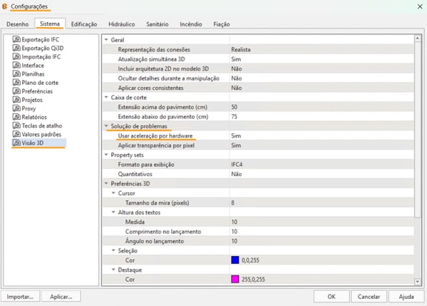 - Usar aceleração por hardware: quando a opção for Sim, o programa utilizará dos recursos gráficos da placa de vídeo para melhorar o desempenho na visualização no 3D.