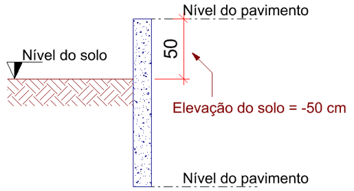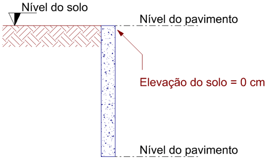- Nível do solo acima do nível do topo da parede: Para este caso a elevação do solo será um valor positivo, correspondente ao desnível entre o nível do solo e o nível do pavimento.
