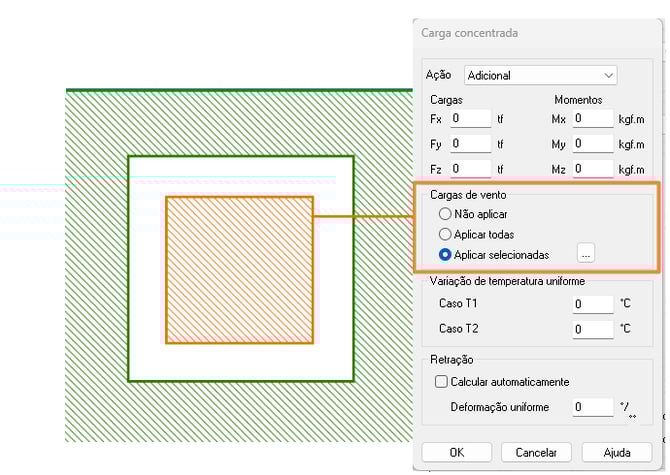 Para o cálculo do pórtico, supõe-se que a força total aplicada em cada pavimento é uniformemente distribuída por este, isto é, dividida pelo número de pilares e aplicada na forma de cargas concentradas horizontais em cada pilar. Essa hipótese de distribuição uniforme é válida apenas para pilares ligados por vigas e lajes que funcionem como diafragmas rígidos. Ou seja, as lajes são consideradas como infinitamente rígidas no seu plano, garantindo um comportamento mais real da estrutura, de modo que todo o pavimento se desloca em conjunto, gerando forças constantes ao longo dos pilares.Em casos específicos, alguns pilares não sofrerão a ação do vento. Pilares isolados dentro da estrutura, por exemplo, não sofrerão ação direta. Quando isto ocorre, pode ser interessante desabilitar as forças de vento, de modo que estas sejam distribuídas apenas nos pilares que sofrerão a ação do vento, como mostrado abaixo. Isto pode ser feito com um duplo clique sobre o pilar em questão e então sobre o botão Cargas. Na janela que se abre, você pode desabilitar as forças de vento que deseja desconsiderar.