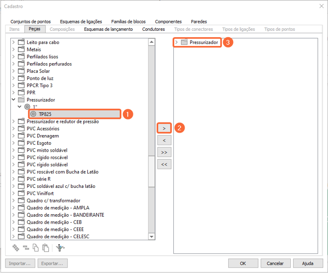 >(passo 2) para mover os itens para o campo da direita da janela (passo 3), que lista os itens selecionados para a exportação.