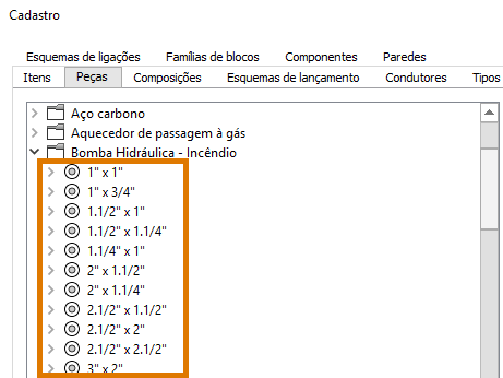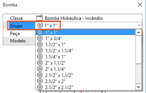 Na plataforma AltoQi Builder, o nome do grupo de bombas sempre segue a ordem Diâmetro de Entrada x Diâmetro de Saída. Na imagem abaixo são apresentados alguns grupos disponíveis no cadastro de peças padrão do programa.