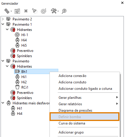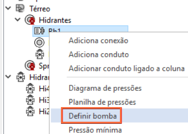 e processar o projeto, a opção Definir bomba fica disponível, já que o programa consegue reconhecer os hidrantes inseridos na rede.