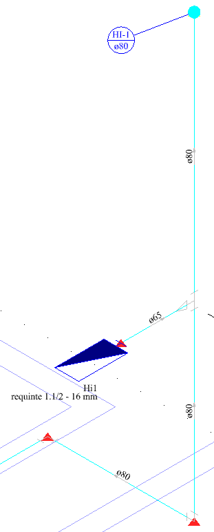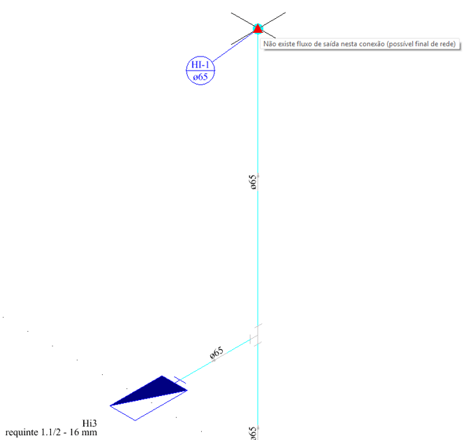 Tanto nos hidrantes quanto em outros trechos do lançamento pode haver fluxo interrompido, como na imagem a seguir. Estes casos podem ser ajustados invertendo sentido do conduto como descrito no artigo Como inverter o sentido de fluxo dos tubos do projeto hidrossanitário, de gás e incêndio?.