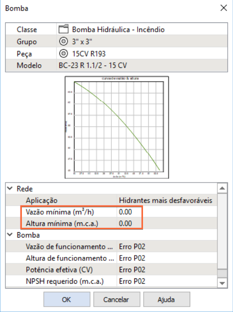 Por que a vazão e altura mínimas da rede estão zeradas ao definir a bomba hidráulica?
