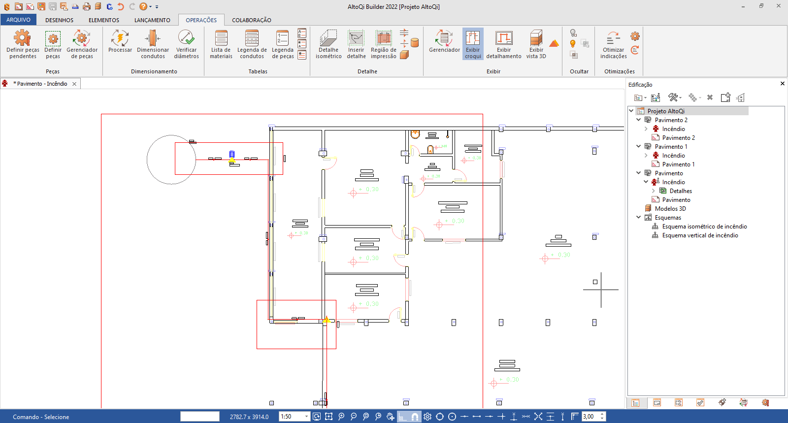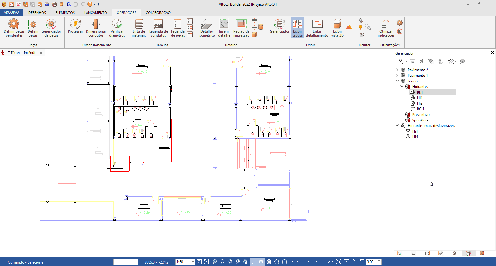 - Após ajustar todas as indicações, processe o projeto de Incêndio, conforme procedimento do artigo Como processar o dimensionamento no AltoQi Builder?.