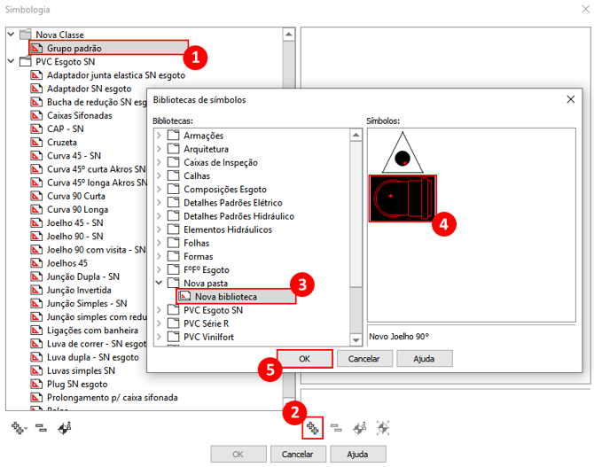- Na sequência escolha na janela "Biblioteca de símbolos" a pasta e a biblioteca de símbolos criada anteriormente(3), escolha a simbologia(4) na lateral direita da janela e clique em "Ok"(5), como indicado na imagem a seguir;