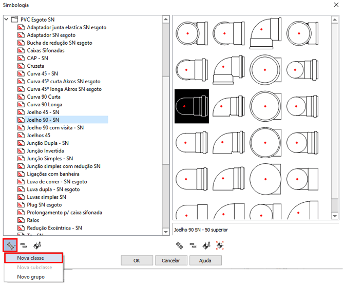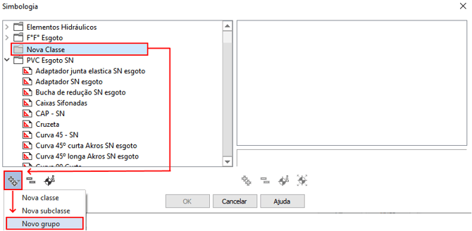 - Caso o símbolo desejado tenha sido recém criado, selecione "Adicionar", opção "Nova classe", na parte inferior da janela, destacado em vermelho na imagem a seguir;