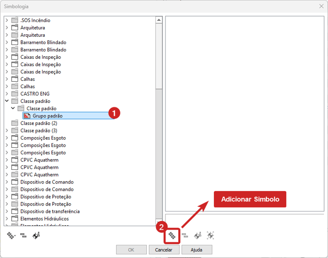 - Após criar um novo grupo(1), clique em "Adicionar"(2) na região inferior da janela de simbologia;