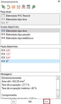 - Na janela Dimensionamento serão exibidos todos os eletrodutos que o programa recomenda que tenham a seção alterada;