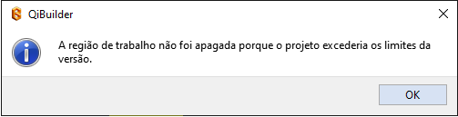 Portanto, ao tentar lançar elementos fora da região de trabalho já existente, a seguinte mensagem é exibida: "A operação não pode ser realizada porque o projeto excederia os limites da região de trabalho definida." e o lançamento não é realizado.