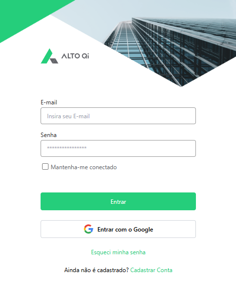 - Insira seu e-mail e senha do login integrado AltoQi.