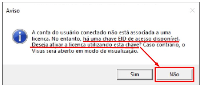 1 - Mensagem: "A conta do usuário conectado não está associada a uma licença. No entanto, há um chave EID de acesso disponível. Deseja ativar a licença utilizando esta chave? Caso contrário, o Visus será aberto em modo de visualização."