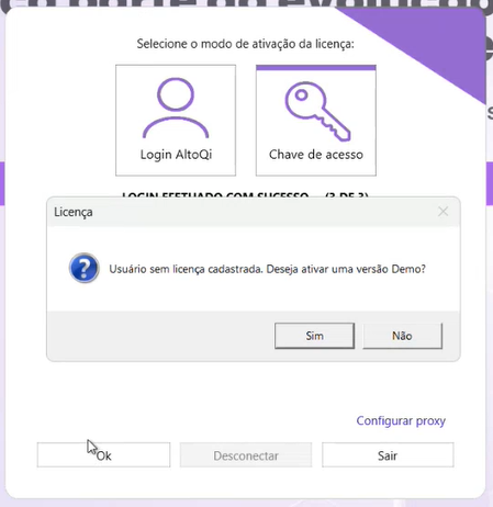 - Causa: Em casos onde o usuário nunca tenha ativado uma licença demonstrativa com seu login, o software irá identificar esta informação. Então solicitará se deseja ativar a versão Demonstrativa.