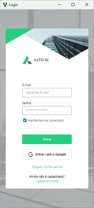 - Caso não possua um login AltoQi criado, clique em "Cadastrar conta", na janela de login, e siga com o preenchimento dos dados para criação do login. Após criado, retorne ao programa e insira suas credenciais.