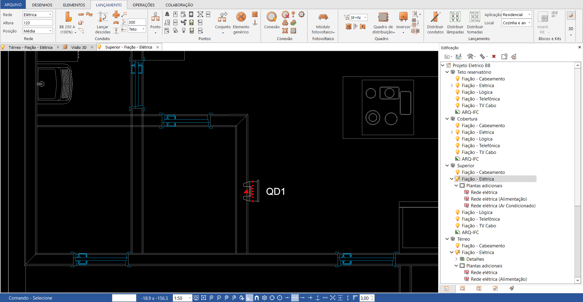 O quadro de distribuição do pavimento superior, ficará alinhado verticalmente com o QD do pavimento inferior já lançado. Para isso, podemos utilizar a funcionalidade de referências externas para lançar o quadro exatamente no na mesma coordenada XY do quadro inferior.