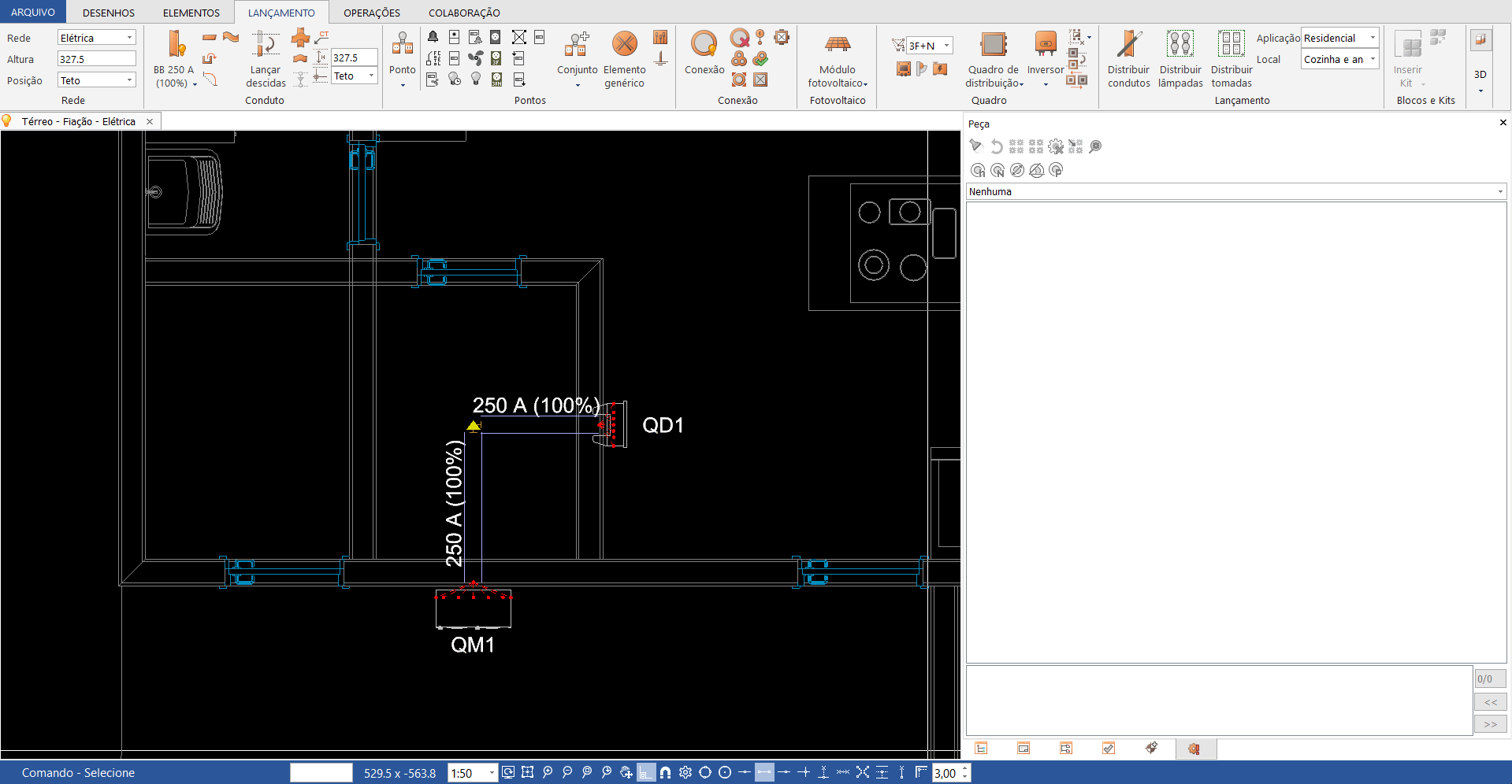 Para demostrar o traçado do barramento e suas conexões, vamos lançar um quadro de medição no mesmo pavimento. Para isso repita o procedimento realizado para lançar o quadro de distribuição. Porém, vamos selecionar uma peça da classe: Quadro de medição - CELESC (barr blindado) peça: WEG - MINI - Barr 250A- 4 Medidores