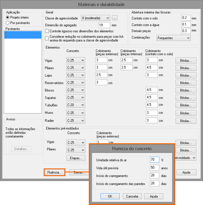 Neste grupo de configurações é possível definir a resistência característica (fck) de cada elemento estrutural do projeto, o cobrimento dos elementos estruturais e as bitolas que podem ser utilizadas no detalhamento dos elementos. É importante ressaltar que caso tenha-se adotado uma resistência característica (fck) ou cobrimento com valores menores que o recomendável na NBR6118:2014 são gerados avisos que podem ser verificados através do botão Detalhes.