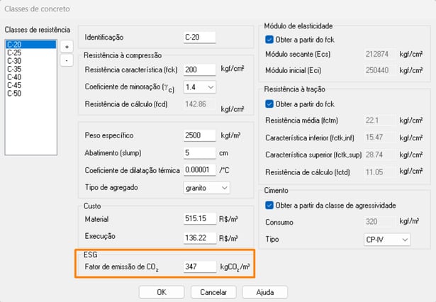 Os valores adotados pelo programa para a confecção dos relatórios de carbono incorporado são definidos no programa junto ao custo dos elementos.