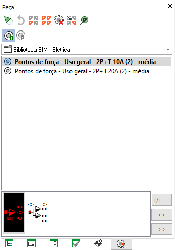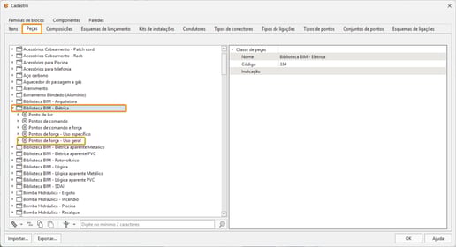 No Cadastro, aba Peças, procurar a classe de peças Biblioteca BIM Elétrica e o grupo de peças Pontos de força - Uso Geral.