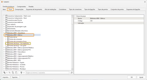 No Cadastro, aba Peças, procurar a classe de peças Biblioteca BIM Elétrica e o grupo de peças Pontos de força - Uso Específico.