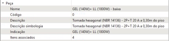 - Modifique o nome da peça que acabou de ser colada. No caso do exemplo será criado uma tomada dupla aonde uma das tomadas possui a potência de 140 W (Geladeira) e a outra de 1800 W (Lavadora de louças), portanto o nome escolhido foi GEL (140W)+ LL (1800W) - baixa. Modifique da mesma forma a descrição e a descrição da simbologia. Recomenda-se nesse caso também incluir uma indicação.