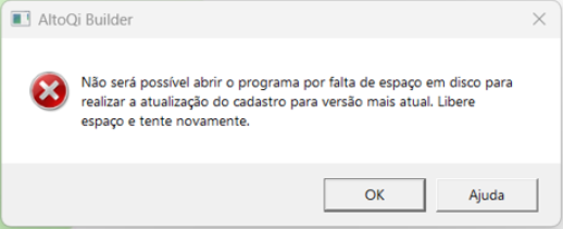 Conforme orientado no artigo Configurações mínimas e recomendadas para a utilização das soluções AltoQi, é preciso existir, no mínimo, 20 GB de espaço disponível para o funcionamento satisfatório do programa no disco em que o sistema operacional está instalado, comumente o disco local C:. Caso necessário, libere espaço conforme sua disponibilidade.